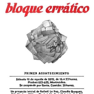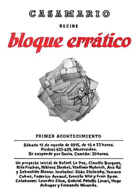 Acontecimiento 1 – «Bloque errático» 15 de agosto de 2015 Bloque errático – Primer acontecimiento Los bloques erráticos son rocas grandes que difieren por su tamaño y por su tipo de la roca nativa de la zona en la que se encuentran. Para la geología histórica, los bloques erráticos durante largo tiempo eran un gran enigma; su investigación provocó el descubrimiento del fenómeno de la glaciarización: se llegó a la conclusión de que fueron transportados por el hielo de glaciares, a menudo a distancias de cientos de kilómetros. Así es que la condición de estar totalmente fuera de su contexto, increíblemente lejos de su origen, fue necesaria para que la ciencia pudiera entender la verdadera fuerza atrás del fenómeno, el repentino cambio climático. El tema del primer acontecimiento tiene que ver con la memoria: memoria de la casa, del barrio, de la ciudad. Sin embargo, no quisimos caer en el paradigma tan contemporáneo de que la memoria y el recuerdo son interesantes por sí mismos. Dimos muchas vueltas, terminamos acercarcándonos a esta memoria de modo indirecto, desarrollando su carácter fragmentado en vez de fabricar historias, y tratamos de crear algunas obras a la manera de los bloques erráticos: grandes, extraños, muy lejos de su contexto. El acontecimiento procura revelar una naturaleza de ser CASA, como un cuerpo informe que plantea interrogantes y problemas en torno a una situación. En esta ocasión hemos construido enunciados, formas, relatos y afectaciones que invitan a reflexionar sobre lo olvidado, la memoria y el futuro… Participan: Rafael La Paz, Claudio Burguez, Rita Fischer, Niklaus Strobel, Vladimir Muhvich, Ana Ro y Sebastián Alonso, Elián Stolarsky, Tamara Cubas, Federico Arnaud, Ernesto Vila y Fran Span. Colaboran: Lourdes Silva, Gabriel Peluffo Linari, Hugo Achugar y Fernando Miranda.