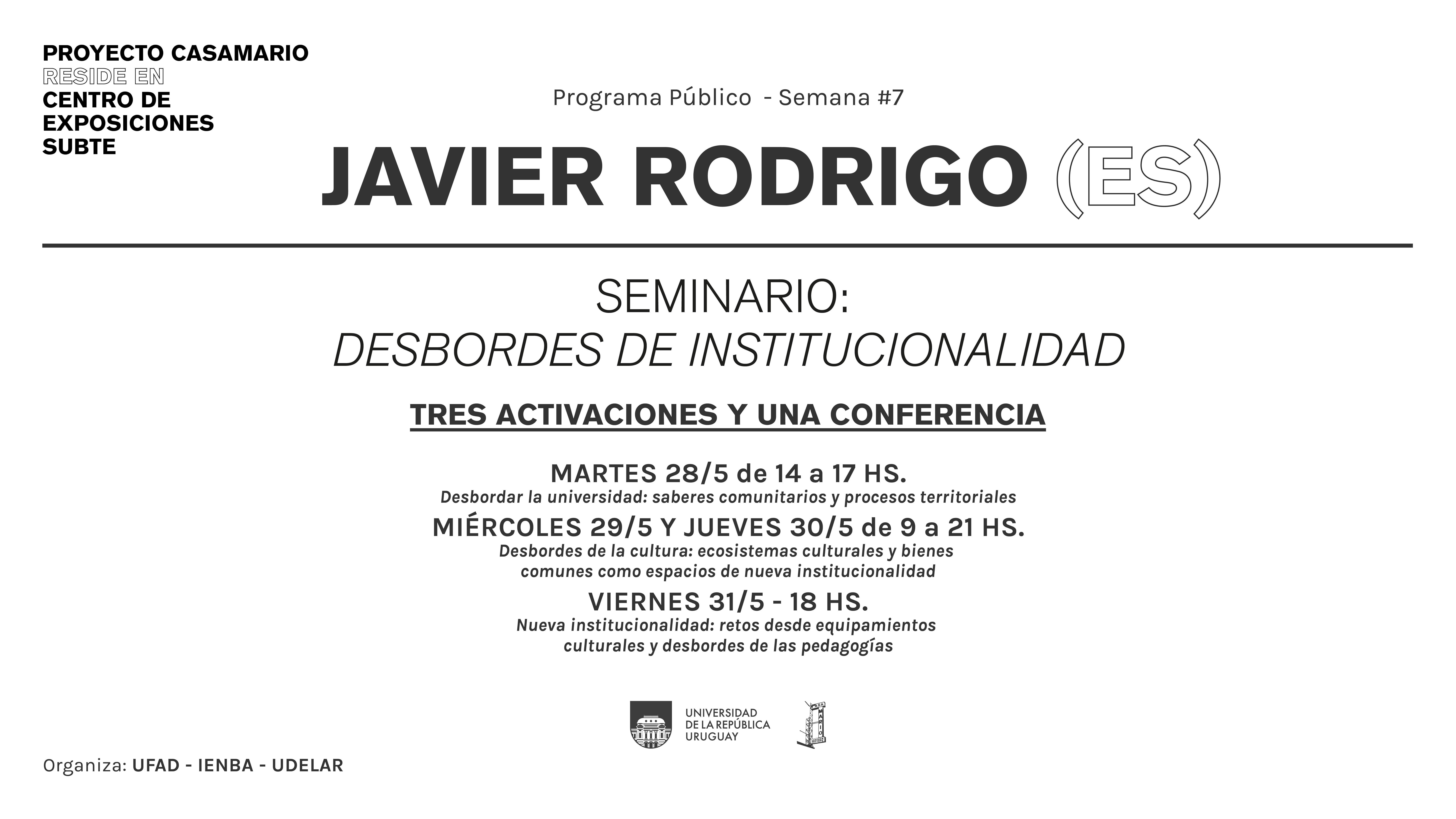 Actividades para la semana #7: varios encuentros junto a Javier Rodrigo La séptima semana de residencia de CasaMario en el Subte cuenta con una serie de actividades propuestas a modo de Seminario junto a Javier Rodrigo (ES), las cuales se realizan en coproducción con IENBA-Udelar. Seminario “Desbordes de institucionalidad”. Tres activaciones y una conferencia Martes 28 de mayo/ 2019. IENBA-UDELAR- 18 de Julio 1772, salón 311, de 14 a 17 hs. Desbordar la universidad: saberes comunitarios y procesos territoriales. Esta presentación pretende plantear modelos de generar desbordes institucionales, que articulan nuevos modelos institucionales de generar saberes , de ampliar horizontes y de habitar y transformar las instituciones como la universidad. Para ello revisando dos ejemplos de casos de estudio (Aulagarden y Interfícies) pretende concretar modelos de transformación institucional basados en las pedagogías colectivas, los saberes comunitarios, la auto-gestión del conocimiento y otros modelos de implicar los aprendizajes y los territorios en los contextos de la universidad. Miércoles 29 y jueves 30 de mayo, de 19 a 21 hs. Centro de Exposiciones Subte- Proyecto CasaMario. Plaza Fabini sin número. Desbordes de la cultura: ecosistemas culturales y bienes comunes como espacios de nueva institucionalidad (Taller de trabajo de dos días) Las políticas culturales habitualmente se han planificado desde patrones y modelos neoliberales demarcados por el paradigma de industrias cultuales, turismo cultural y desarrollismo. Esto se traduce en grandes contenedores de ciudades- marca, ciudades-tiendas, de macro-eventos y súper-exposiciones o bienales internacionales como los hitos del productivismo y el trabajo neoliberal , muchas veces emulando economías basadas en el extractivismo y formas transgénicas de producir/cultivar cultura. En estas jornadas/ taller de dos días pretendemos rescatar otras visiones y prácticas de políticas culturales. Huir del paradigma extractivista de la cultura, y situarnos en otras visiones y prácticas que nos ofrecen modelos de decrecimiento cultural, cooperativismos y alianzas políticas con otras soberanías culturales, y ejercicios de gestión comunitaria y democracia radical en cultura. Experiencias y marcos que rescatamos de investigaciones, publicaciones y modelos institucionales otros de la ciudad de Barcelona, algunos activos ya desde finales de los años 70’s. Estas inciativas nos servirán para hacernos preguntarnos sobre cómo la cultura puede realmente genera otros ecosistemas mas sostenibles y reactivarse bajo las lógicas de los bienes comunes, del decrecimiento e incluso de las economías feministas. Partes del taller/ encuentro En este espacio de taller ofrecemos dos momentos de trabajo: 1er. Día. Presentación de proyectos sobre bienes comunes y políticas culturales : Cohabitar entre + Teatro Arnau y experiencias de gestión comunitaria junto con marcos de bienes comunes y políticas culturales. En la segunda parte realizaremos un mapa de tensiones/ itinerarios 2 – 3 horas. 1 hora presentación+ conversatorio 2do. día: Taller de trabajo sobre bienes comunes y desbordes de la cultura. Situar alguno de los marcos críticos y generar un taller de genealogía de otras historias sobre cultura-cooperativismo-educación popular y bienes comunes en trabajo por grupos y después una puesta en común de historias y herramientas. 2 a 3 horas también. 1 h presentación breve + taller. Viernes 31 de mayo, 18.00 hs. IENBA, salón 318 (enmarcado en el Seminario Mayo-extenso). 18 de Julio 1772. Nueva institucionalidad: retos desde equipamientos culturales y desbordes de las pedagogías. Las formas de pensar la institución cultural y educativa siempre se han desarrollado en marcos de trabajos de transformación institucional desde la autonomía, la auto-organización y los procesos de vanguardia que tensionan, rompen, dislocan o transgreden desde líneas vanguardistas. Esta presentación pretende revisar unas serie de prácticas desde las pedagogías colectivas como desbordes institucionales que ponen el énfasis en formas de cruces y mediaciones , donde la gestión del conocimiento, el estar juntas y habitar las instituciones de otras formas, suponen modelos de transformación institucional diferentes. La presentación repasará algunas de las acciones de transductores desde 2011 hasta neutros días, donde los desbordes institucionales, las prácticas de pedagogías y las alianzas con centros formativos y la generación de otras formas de aprendizajes son vectores que representan un cambio hacia un decrecimiento cultural y otros modelos de políticas de cuidados y de implicaciones diversas en las instituciones. Materiales & links Translab amarika Interfícies: plataforma de salud y cultura comunitaria, con énfasis en el cruce de saberes entre estudiantes universitarios, creadores y contextos de salud comunitaria. Desbordar la universidad: programa dentro de Cohabitar entre Interficies desbordar la universidad translab amarika Links de libros/ publicaciones Desbordar la cultura: relato alternativo de la cultura a la ciudad Gestión comunitaria de la cultura: valores, retos y propuestas (2018) (Libro). Cohabitar Entre [Emergencias institucionales- Prácticas artísticas- Procesos colectivos] – Teatro Arnau Xarxa Espais comuntiaris Barcelona Las actividades están destinadas a docentes, egresados/as y estudiantes del último año de las carreras del Área Social y Artística, a docentes interesados/as en la temática y público en general. Actividad enmarcada en los Seminarios de Formación Docente-UFAD-IENBA-UDELAR, y el Programa Público de “Proyecto CasaMario reside en Centro de Exposiciones Subte”. Convoca: Unidad de Formación y Apoyo Docente, Instituto «Escuela Nacional de Bellas Artes»/Escuela Universitaria de Música, Universidad de la República; apoya URM-IENBA. Actividad producida y co-cordinada por la UFAD-IENBA y Proyecto Ca