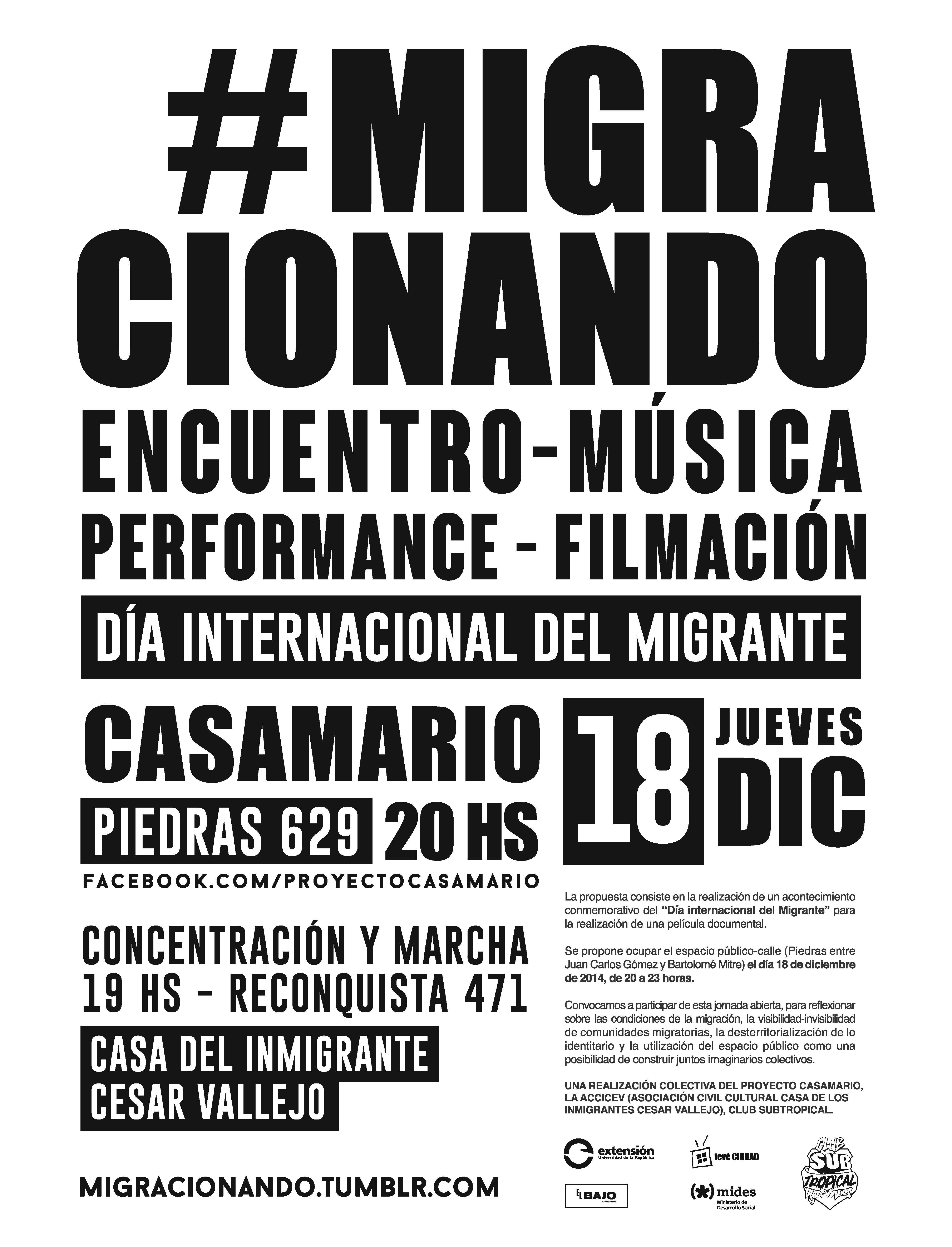 #MIGRACIONANDO #MIGRACIONANDO [ENCUENTRO, MÚSICA, PERFORMANCE y FILMACIÓN] Jueves 18 de diciembre 20 horas [Día internacional del migrante] CONCENTRACIÓN y MARCHA 19 hs desde Casa del Inmigrante Cesar Vallejo (Reconquista 371) hasta CasaMario (Piedras 629). Una realización colectiva del Proyecto CasaMario, la ACCICEV (Asociación Civil Cultural Casa De Los Inmigrantes Cesar Vallejo), Club Subtropical. La propuesta consiste en la realización de un acontecimiento conmemorativo del “Día internacional del Migrante” para la realización de una película documental. Se propone ocupar el espacio público-calle (Piedras entre Juan Carlos Gómez y Bartolomé Mitre) el día 18 de diciembre de 2014, de 20 a 23 horas. Convocamos a participar de esta jornada abierta, para reflexionar sobre las condiciones de la migración, la visibilidad-invisibilidad de comunidades migratorias, la desterritorialización de lo identitario y la utilización del espacio público como una posibilidad de construir juntos imaginarios colectivos. Participan y colaboran: Capítulo Uruguay de la PIDHDD (Plataforma Interamericana de Derechos Humanos Democracia y Desarrollo). Asociación Latinoamericana de Medicina Social (ALAMES) Amnistía Internacional – Sección Uruguay Centro Interdisciplinario de Estudios sobre el Desarrollo (CIEDUR) Cotidiano Mujer Instituto del Tercer Mundo (ITEM) Madres y Familiares de Uruguayos Detenidos-Desaparecidos Redes- Amigos de la Tierra Servicio de Paz y Justicia (SERPAJ) OIM – Uruguay EMAUS Observatorio de Políticas públicas de Derechos Humanos del MERCOSUR Espacio Sin Fronteras ACCICEV (mas fotos)